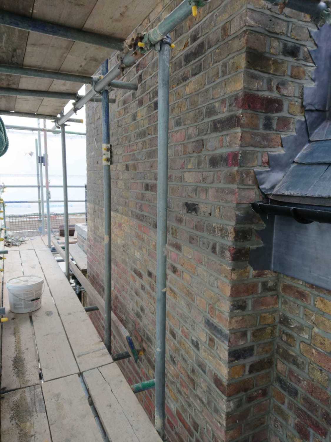 Here with the assistance of Helifix who provided a detailed survey to help extend a chimney breast externally to provide space for a shaft internally all the bricks used for the build were tinted to blend with the old, the second photo shows the tinting in progress.
