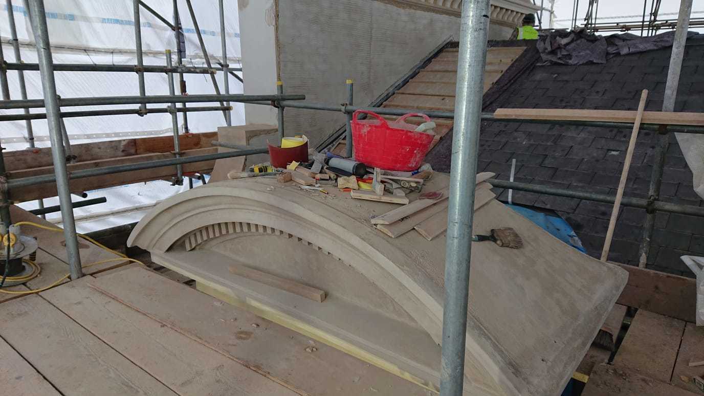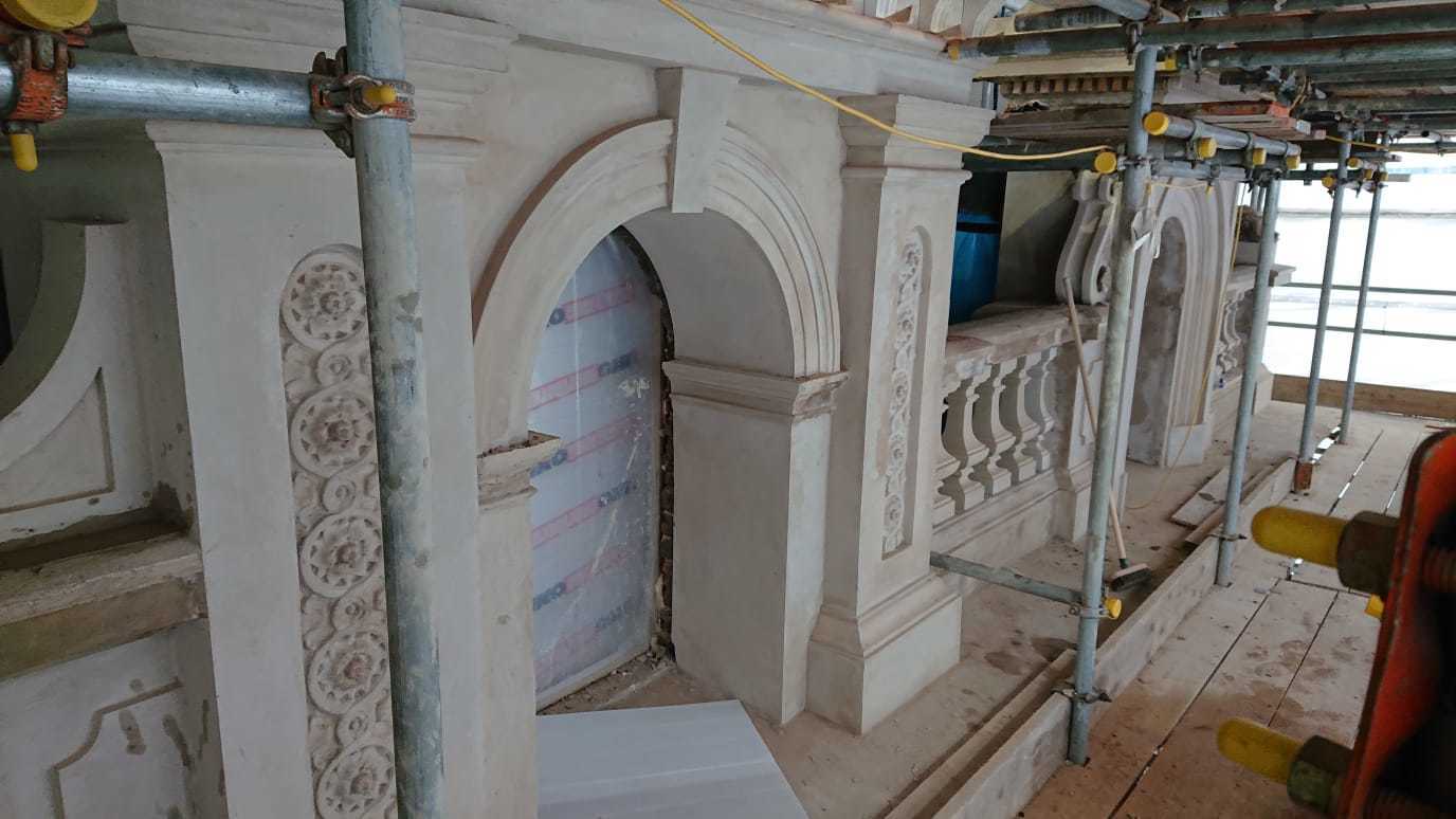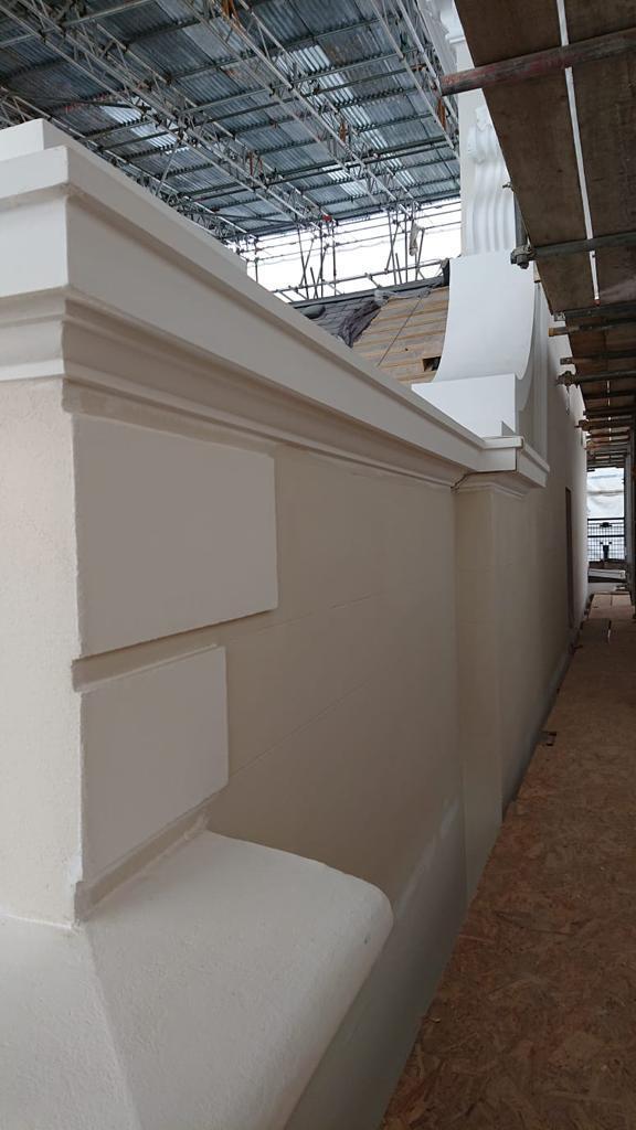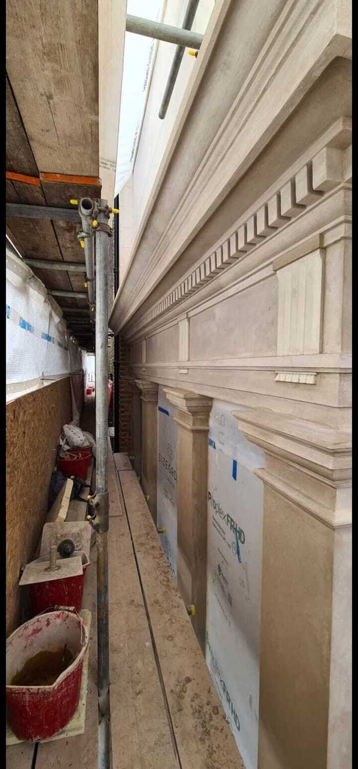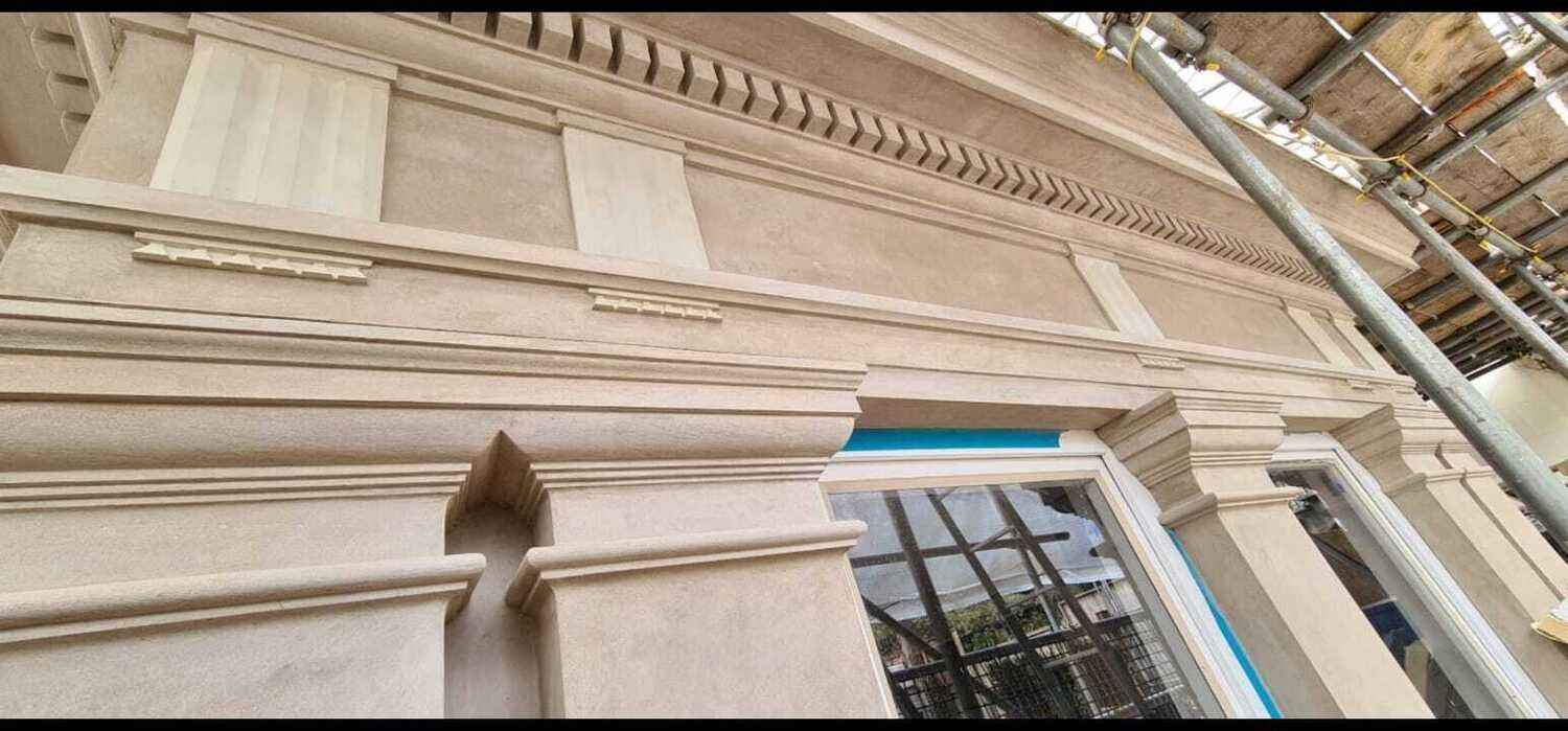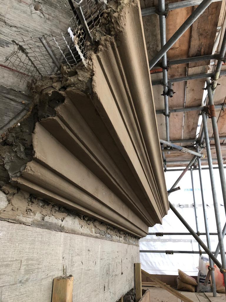 This is one of our recent projects that involves a full restoration to the feature work on the facade. The photos are showing working progress with the stucco moulds on this project.
