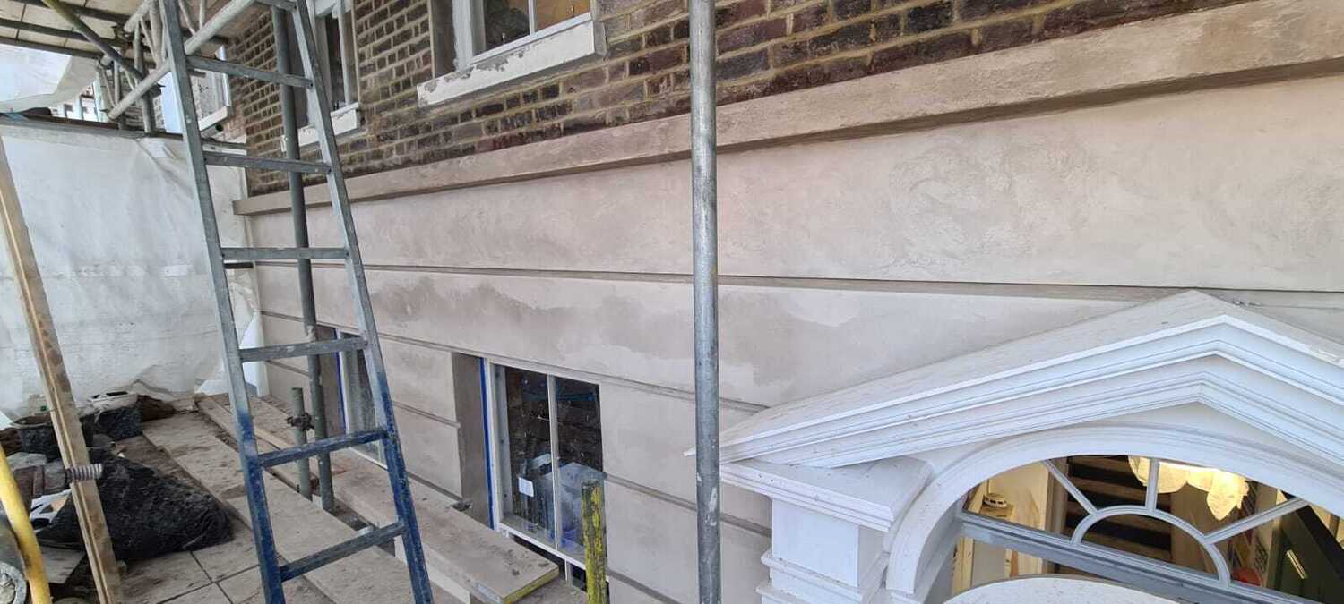 Remove the old then reform the rusticated render to the front elevation.